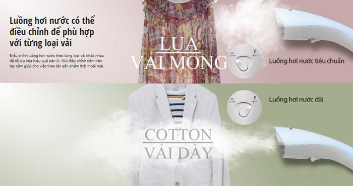 Máy có 2 chế độ hơi nước để người tiêu dùng có thể điều chỉnh linh hoạt theo từng chất liệu vải, tối ưu hóa hiệu quả bàn ủi.