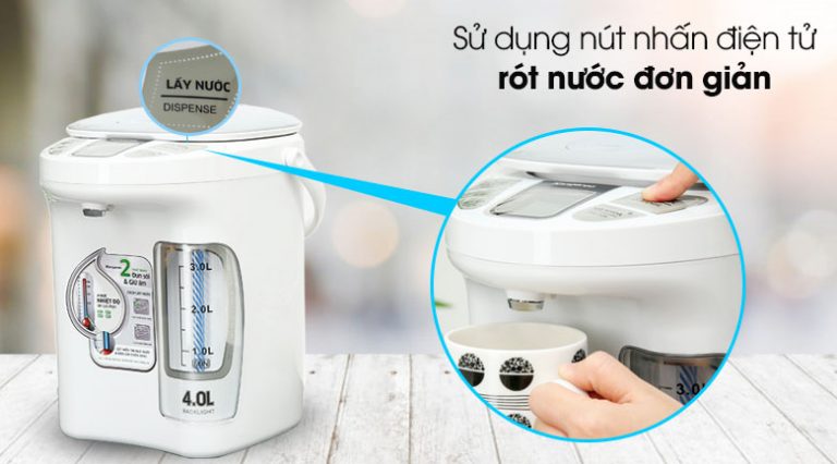 Cách lấy nước thứ 2 cũng rất tiện dụng, bình thủy KG4K1 được thiết kế cần gạt ngay bên cạnh vòi xả nước, bạn chỉ cần đưa miệng cốc đến phía dưới miệng vòi rồi đưa cốc chạm nhẹ vào cần gạt là sẽ có ngay nước sôi để dùng.