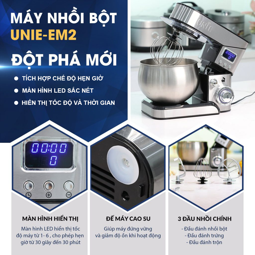Có khả năng kết hợp với nhiều loại phụ kiện giúp việc chế biến món ăn đa dạng hơn, tiện dụng và hiệu quả cao hơn. Bạn có thể sử dụng máy nhồi bột Unie EM2 để làm rất nhiều loại thực phẩm khác nhau như: Nhồi bột làm các loại bánh, Nhồi bột làm mì kéo sợi, đánh trứng, làm bánh kem,…