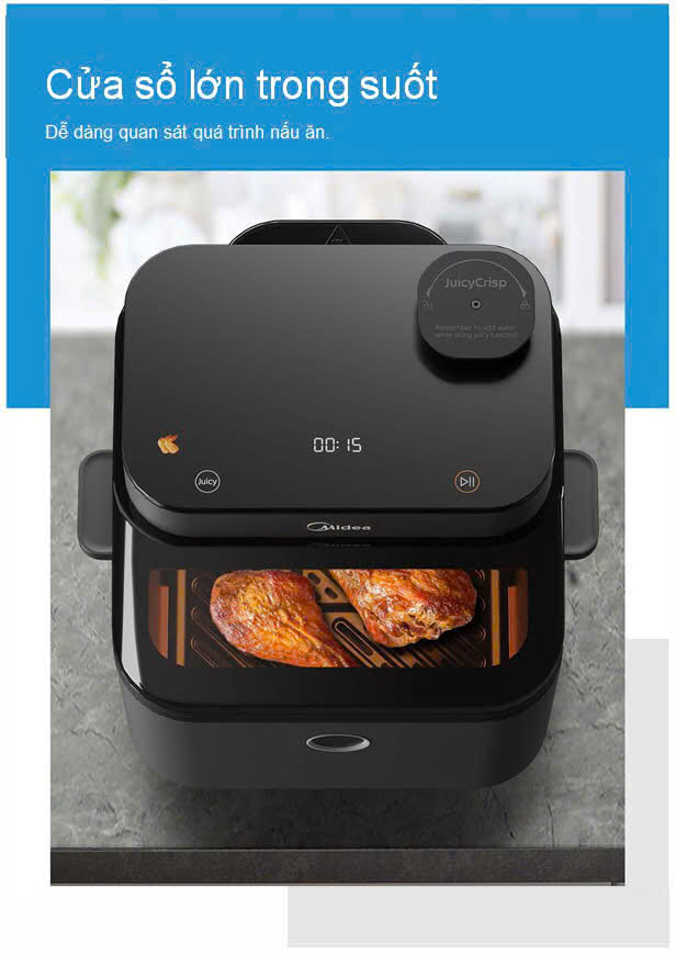 Mô tả chi tiết về Nồi chiên không dầu hơi nước Midea MF-7523T – 7.3 lít, làm nóng 360 độ hơi nước, nắp kính trong suốt.