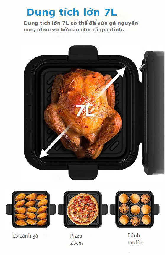 🔅 Dung tích 7L giúp nồi vừa gọn gàng, vừa phù hợp để chiên, nướng gà cho cả gia đình thưởng thức