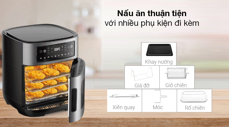 Gồm khay nướng, giá đỡ, giỏ chiên, xiên quay, móc, rổ chiên.