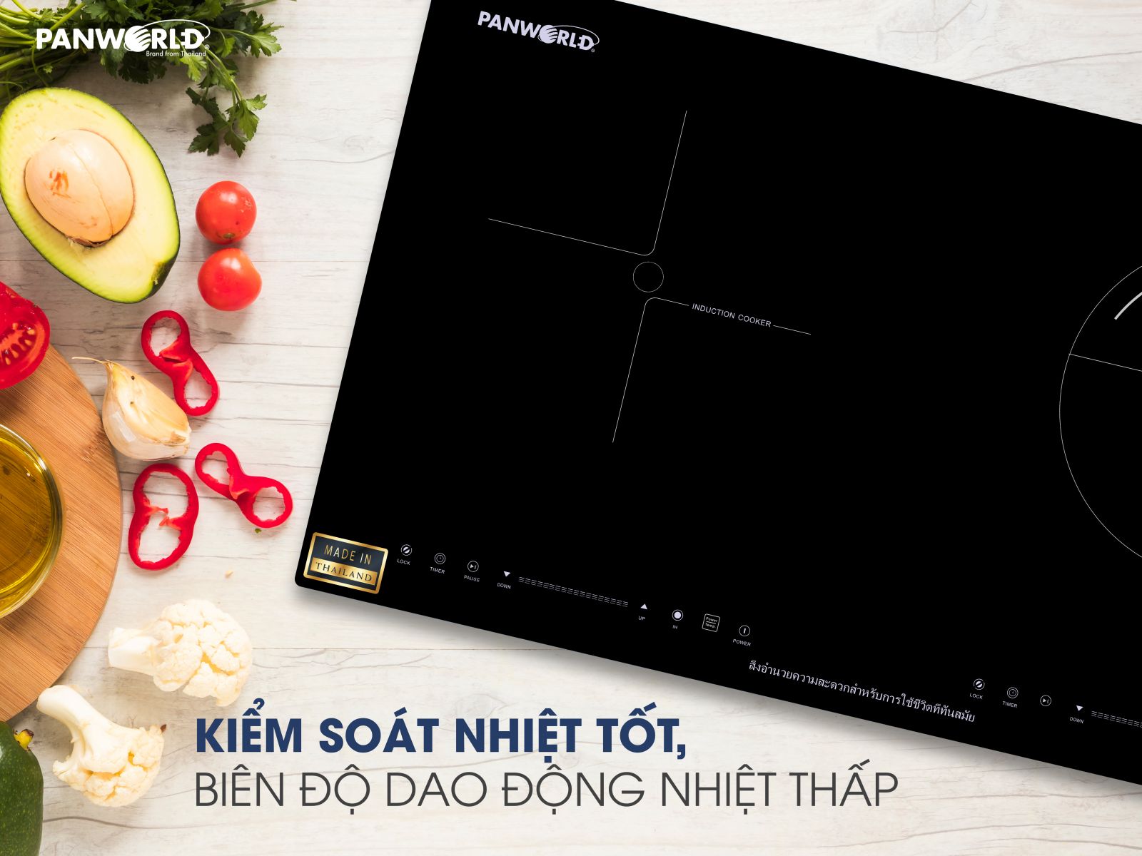 Kết nối thông minh của Bếp đôi từ - hồng ngoại Panworld giúp người dùng dễ dàng kiểm soát mức nhiệt khi nấu: Vận tốc quạt tản nhiệt tự động điều chỉnh theo cấp độ hút, kết hợp chức năng quản lý mức gia nhiệt cùng 2 mức hiển thị nhiệt dư. Ngoài ra, biên độ giao động nhiệt gần như 1 đường thẳng (không có nhiều sự thay đổi nhiệt độ khi nấu) giúp món ăn trở nên ngon hơn, đặc biệt là các món ninh, hầm, kho,…
