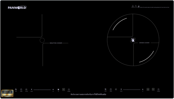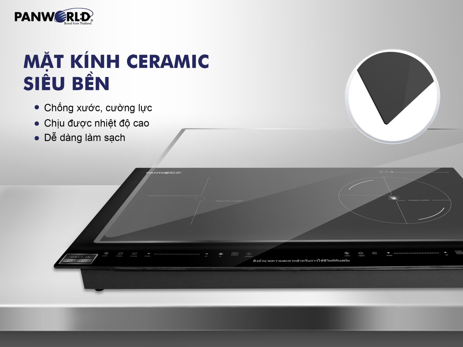 Mặt trước và mặt sau Bếp đôi từ - hồng ngoại Panworld PW-1924 được thiết kế tỉ mỉ từng đường nét. Mặt bếp làm bằng kính Ceramic cao cấp siêu bền, chịu lực va đập tốt, chống trầy xước, chịu nhiệt sốc nhiệt lên đến 750 độ C.