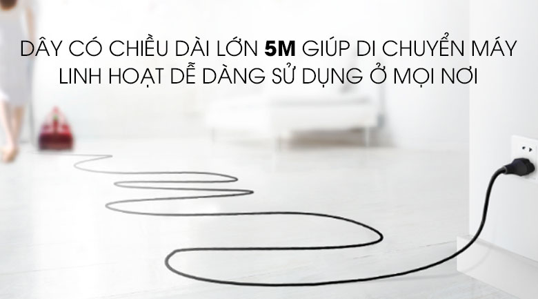 Dây điện dài 5m, di chuyển máy làm sạch cả không gian rộng như phòng khách, phòng ngủ lớn.