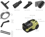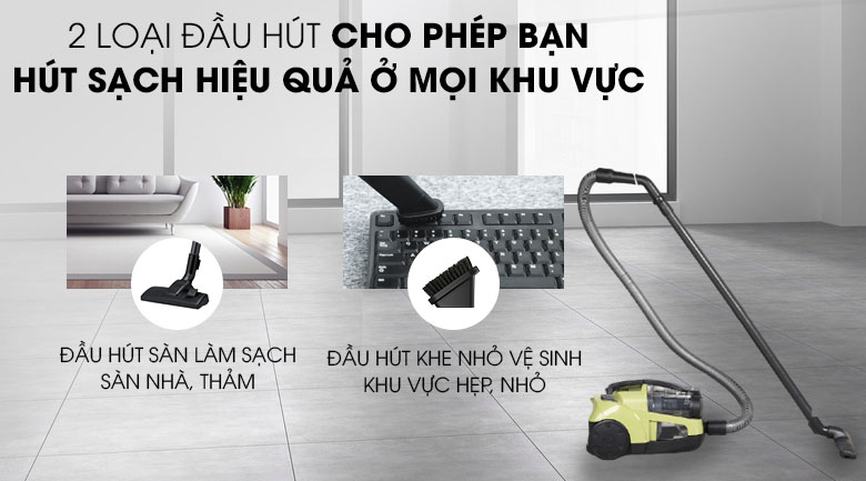 Máy trang bị 2 đầu hút cho máy hút bụi là đầu hút sàn, đầu hút khe - bàn chải