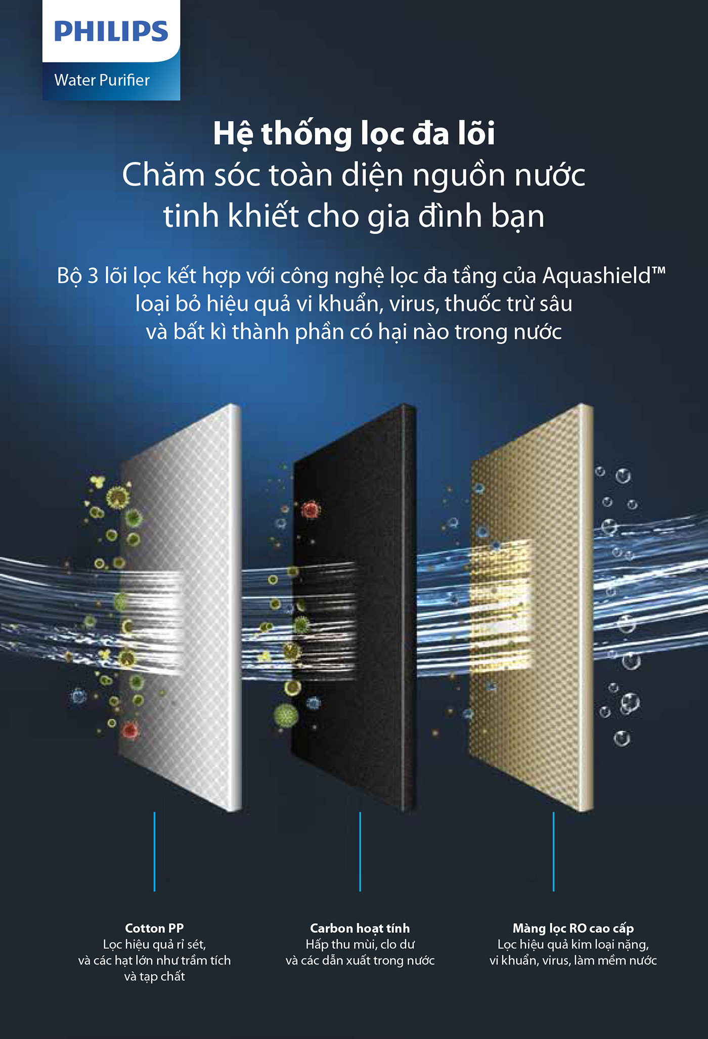 Máy lọc nước RO Philips AUT2015 sử dụng bộ lọc kết hợp gồm hai lõi lọc thô, lõi carbon để khử mùi và lõi lọc thẩm thấu ngược RO, giúp loại bỏ hoàn toàn các chất kim loại nặng, vi khuẩn, chất hữu cơ và cặn bã với kích thước nhỏ tới 0,0001m.