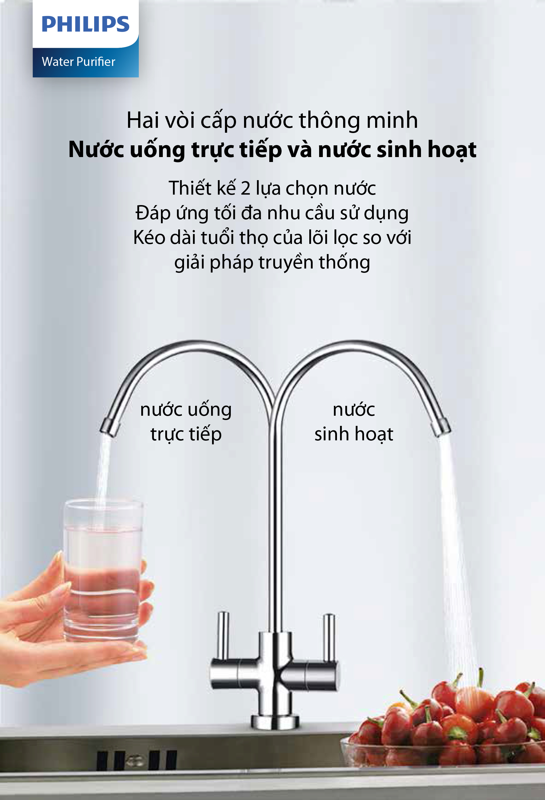 RO Philips AUT2015 thiết kế nhỏ gọn, không sử dụng bình chứa và có hai vòi nước ra:
