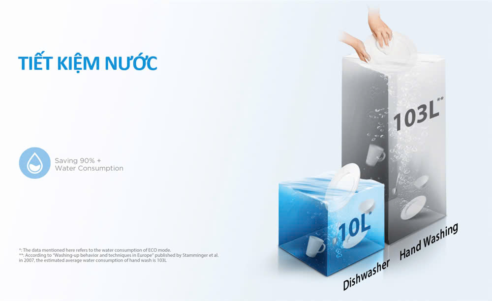 *:Dữ liệu được đề cập ở đây đề cập đến mức tiêu thụ nước của chế độ ECO. *: Theo "Hành vi và kỹ thuật rửa tay ở Châu Âu" do Stamminger et năm 2007 xuất bản, lượng nước tiêu thụ trung bình khi rửa tay ước tính là 103L