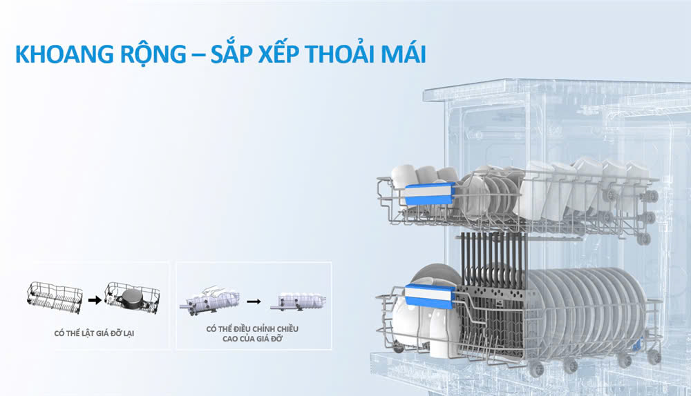 Cho phép bạn xếp chồng nhiều loại bộ đồ ăn, đồ thủy tinh và cả dụng cụ nấu nướng. Với thiết kế khoang rộng chứa được 13-14 bộ chén đĩa, giúp việc sắp xếp trở nên dễ dàng hơn bao giờ hết.