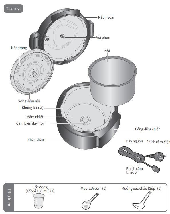 Đặc điểm | 12 Chương trình nấu tự động Thịt, Gà, Súp, Đậu, Hấp, Món hầm, Nấu cơm nhanh, Gạo lứt, Nấu áp suất, Nấu chậm, Lẩu nắp mở, Vệ sinh | ||