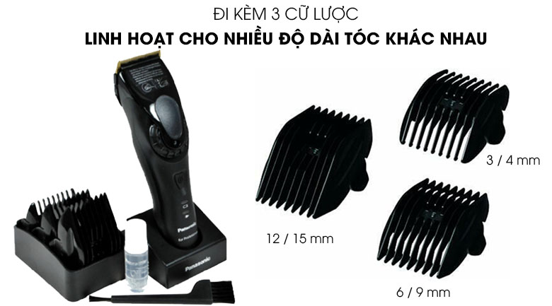 Thiết bị đi kèm các cữ lược để cắt đến 6 độ dài khác nhau (từ 3 đến 15mm ). Có 3 cữ lược đi kèm với thiết bị, cho phép cắt đến sáu độ dài tóc khác nhau (3 đến 15mm). Cữ lược có một hộp đặc biệt đi kèm giúp bảo quản gọn gàng.