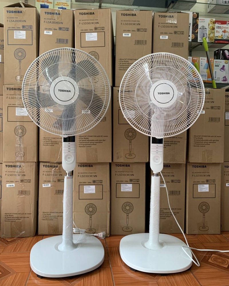 Quạt đứng Toshiba kết cấu thon gọn, chân đế lớn, giữ quạt đứng ổn định trên mọi mặt phẳng. Chiều cao quạt có thể thay đổi trong khoảng 113 - 133cm.