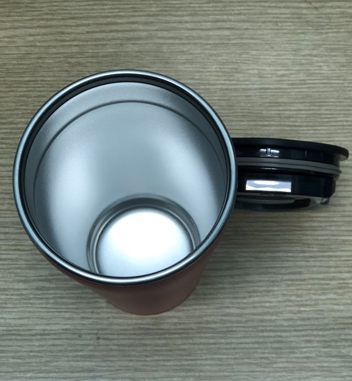 Ly giữ nhiệt bằng thép không gỉ, có nắp đậy (kèm lưới lọc xác trà) có thể tháo rời dễ dàng vệ sinh.