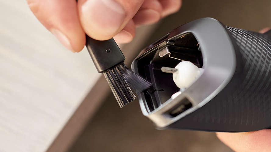 Để vệ sinh đầu cạo, bạn chỉ cần bật đầu cạo ra và dùng bàn chải vệ sinh đi kèm để quét sạch mà không cần tra dầu.